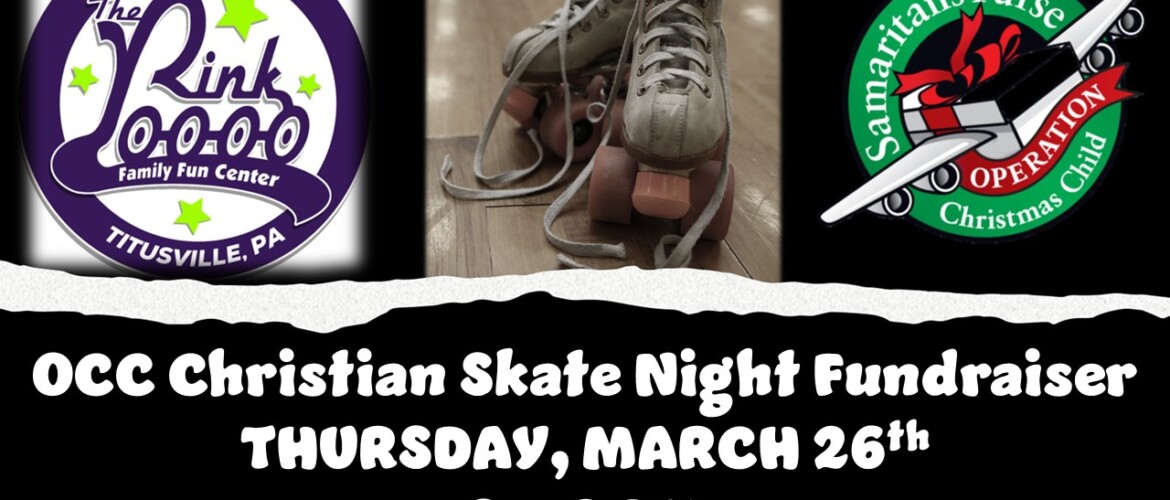 All ages are invited to join us at The Rink Family Fun Center, Thursday, March 26th from 6-8pm for an OCC Christian Skate Night Fundraiser! Admission Cost is $6 plus $3 skate rental fee if needed. Half of admission cost goes directly toward our GFC Operation Christmas Child Ministry!